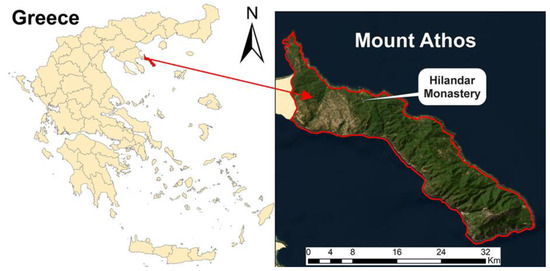 Location of Hilandar Monastery on the Holy Mount Athos Peninsula.