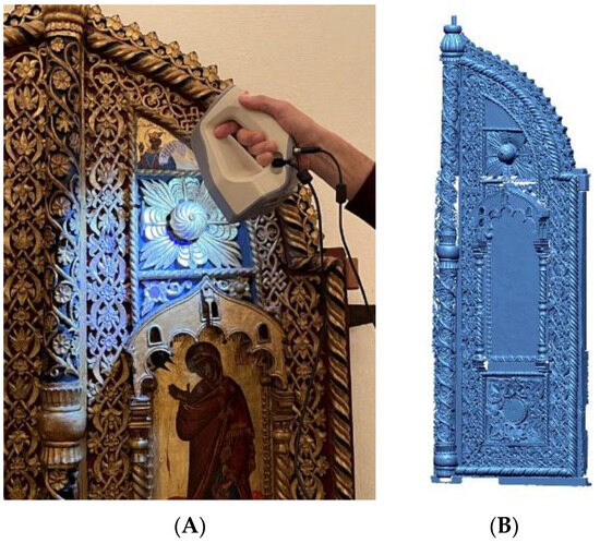 For the continuous 3D scanning of small- and medium-sized heritage objects, Kesik et al. [13] proposed the “3DScaMOTO” methodology that achieved scanning results of good quality. A handheld Artec EVA 3D scanner (Senningerberg, Luxembourg) with structured light was used for the scanning, which offered precision of 50–100 microns and preserved photorealistic texturing. This methodology would contribute to successfully overcome scanning challenges such as an object being movable but with a glossy surface, an object being not movable but of good accessibility, and at last, an object being not movable combined with bad accessibility. Kochov and Stoleska [14] described the methodology they applied to the woodcarving digitization and reproduction process through practical examples. The creation of the digital copy of one wood-carving was implemented using NextEngine 3D Scanner (NextEngine, Santa Monica CA, USA), while the other two were created using the principle of photogrammetry together with the AutoDesk ReCap program v.23.0.0.258. The reproduction of the wood-carvings was carried out using Computerized Numerical Control (CNC) machines (“Uniteam professional 5 axis”, Uniteam, Grgar, Slovenia), as well as 3D printing, while mentioning the cost of equipment and materials. Specifically, they developed a methodology that constitutes an example of reversible engineering for wood-carvings: the digitalization is implemented with one of the available tools, the carving is being “cleaned” in one of the programs found easily on the market, then the section is transferred to appropriate CAD/CAM programs and the 3D printer and/or CNC machine are allowed to do the “magic” work, which constitutes a fusion of engineering with art that is of great historical and cultural importance. Učakar et al. [15] created 3D graphical representations of wooden sculptures with photogrammetry (converting photos into 3D digital models) that were used for 3D printing reproduction, jewelry production, etc., while stating that the new technologies cannot replace real works of art, but that 3D representations offer significant help to conservators and, in addition, allow us to preserve at least the cultural and historical values of those art objects that cannot be preserved for various reasons. Neamțu et al. [16] presented the methodology applied in the digitization and digital restoration of imperial gates from wooden churches in Transylvania, to show the degradation of these cultural heritage objects over time. The procedure for digitally restoring the object to its pristine state included X-ray fluorescence (non-destructive elemental analysis (XRF) with a handheld Bruker spectrometer), FTIR spectroscopy measurements (with a Jasco 6100 spectrometer, Easton, MD, USA) and scanning and digitization using a Creaform Go!SCAN 50 structured light scanner (Go!SCAN, AMETEK, Bangkok, Thailand). Carvajal et al. [17] used the Mu3D digitization system based on digital photogrammetry to create virtual museums, applying digital photogrammetry and computer 3D modeling. They concluded that the same virtual environment can be arranged either for different collections or the same collection in a different layout that fits different groupings of objects that respond to different contexts, uses and users.