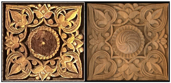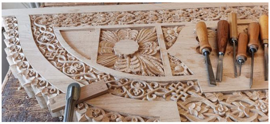 The CNC-machined oak wood-carving (Figure 8) was improved and refined in its carving details by hand-crafting by an experienced wood-carver (Figure 9, Figure 10 and Figure 11). Human contribution is particularly important, since it is the part that provides the final details’ configuration to a wood-carving and, moreover, the appearance of a hand-made wood-carving piece similar to the original one. During the reproduction process, an attempt has been implemented, in order any potential signs of destruction, wear or tear caused to the original Bema door during its 408-year life (since the construction year) were not reproduced.