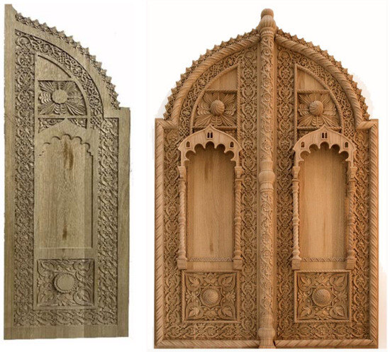 It is worth mentioning that the processing of the high-relief decorative parts of the Bema door was separated from the shaping work of its superficial wood-carved parts, which preceded it (Figure 6). Moreover, in the original Bema door all its high-relief parts are added and glued on the surface of the Bema door leaves.