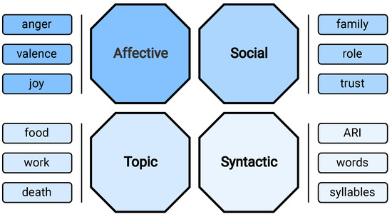 The lexicon-based feature vector is derived from the framework elucidated in Section 3.2, which contains features from different categories: affective, social, syntactic, and topic-related. Given the set of categories considered C = { C A , C S O , C S Y , C T } , we can define the set of features included in our framework as follows:
