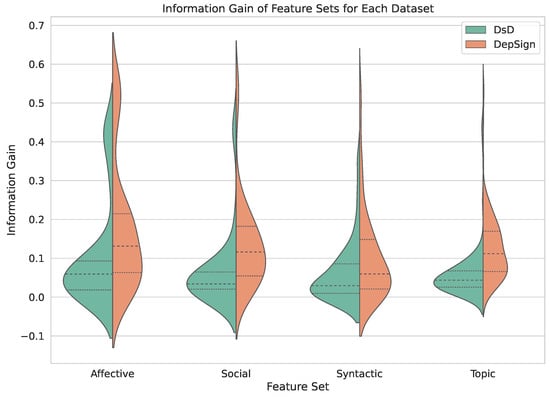 Figure 2 shows the distribution of the information gain values attained for each set of characteristics. The substantial portion of the information gain values clustering around 0 suggests a considerable number of features that do not contribute significantly to the classification task. However, the presence of an extended tail in the distribution for all feature sets suggests the existence of features that have the potential to impact the classification model’s performance positively. Upon closer examination, we observe wider sections for high information-gain values within the affective set, indicating a greater abundance of features with substantial information gain in this category. In contrast, the topic set displays a narrower tail in the DsD dataset, suggesting fewer topic-related features with notable information gain. However, while for the DsD dataset, the distribution is substantially flattened around the lower values, for the DepSign dataset, it is distributed towards the middle values. This suggests that a priori this set of features has more potential in the DepSign dataset.