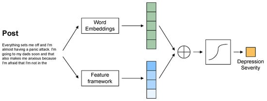After analyzing the feature framework, our next objective is to take advantage of it in the development of a machine-learning model capable of detecting the intensity of depressive symptoms in the textual data. The problem to be solved is the detection of the depression severity level l i expressed in a post p i . According to the datasets considered (see Section 3.1), l i { Minimal , Mild , Moderate , Severe }  for the DsD dataset, and l i { Not depressed , Moderate , Severe }  for the DepSign dataset. To achieve this, we propose an ensemble model [67] that combines lexicon-based features with distributional representations. An overview of the proposed approach can be seen in Figure 3.