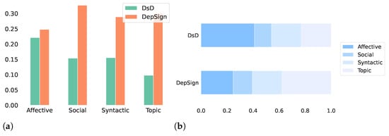 We can see that for both datasets, affective features are consistently among the top-selected categories. Figure 4a shows that approximately 22% to 24% of the total set are selected for each dataset, while Figure 4b shows that this set is the one with more representation in the DsD dataset and the second one in the DepSign dataset. This suggests that emotional expressions and sentiment-related content are crucial in detecting depression. Furthermore, the syntactic features are consistently represented in both datasets. In contrast, social characteristics are less represented among the selected features. It is worth mentioning, however, that this is the set with a smaller size.