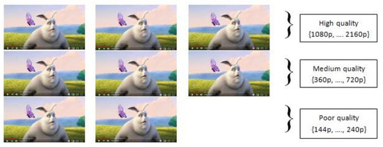 Based on the empirical findings, we categorized the qualities into three distinct classes: Qhigh, Qmedium and Qpoor. These are visually depicted in Figure 1. To define these classes, we establish the following quality sets: Qhigh = {1080p, …, 2160p} representing high quality, Qmedium = {360p… 720p} representing medium quality, and Qpoor = {144p… 240p} representing poor quality. The quality level qt of a given segment si can be classified into the quality set Q = {Qhigh, Qmedium, Qpoor}, while the bandwidth can be categorized into the set Bw = {Bwlow, Bwmedium, Bwhigh}.