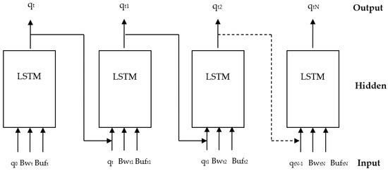 A typical deep neural network (DNN) consists of an input layer, multiple hidden layers, and an output layer. Each layer consists of neurons that are activated based on input from the previous layer using an activation function. In this paper, we use the long-short-term memory network (LSTM) [39]. LSTM stands out as a powerful variant of recurrent neural networks (RNNs) that is widely recognized for its capabilities in processing and predicting sequence data, with a specific emphasis on time-series data. The LSTM unit encompasses four essential components, as visually depicted in Figure 3. These components include a specialized cell that is designed to store and retain information over extended periods. Furthermore, the cell incorporates three important gates: the input gate, the output gate, and the forget gate. These gates serve as vital mechanisms for controlling the flow of information into and out of the cell. In our specific context, we train the LSTM to intelligently preserve quality information from previous segments while disregarding historical details such as bandwidth and buffer state information.