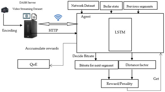 Several DRL-based approaches and frameworks have been presented in the literature, some of which employ intricate neural network architectures, often combining multiple neural networks. In contrast to the cited works, we proposed a novel DRL-based approach utilizing an LSTM neural network that takes into account the holistic environment when determining the next bitrate. In our DRL approach, a single deep neural network approximates the policy. We have incorporated a novel factor known as “distance” to aid in bitrate selection, all in the pursuit of enhancing the QoE. Our primary objective is to deliver optimal dynamic adaptation in highly complex and dynamic environments.