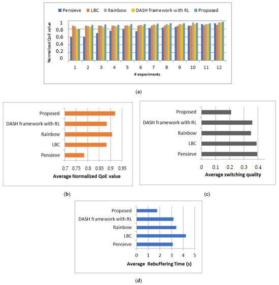 Figure 11 illustrates that our approach has the highest values in terms of normalized QoE value, average normalized QoE value, average switching quality, and average rebuffering time compared to the existing schemes, particularly, in low and fluctuating bandwidth conditions, the proposed approach and existing schemes showed high performance, but in medium and low bandwidth conditions, the proposed approach provided high and stable QoE.