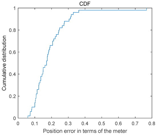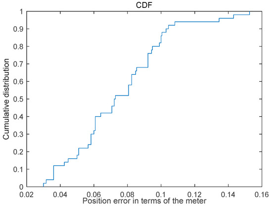 The Cumulative Distribution graph illustrating the static positioning error is presented in Figure 9, revealing that 50% of the positioning results exhibit an error rate below 0.08 m, while 80% demonstrate an error less than 0.1 m; furthermore, the maximum positioning error is below 0.16 m.