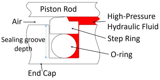 Hydro-pneumatic suspension is widely used in military vehicles, mining trucks, and construction machinery vehicles due to its nonlinear variable stiffness characteristics and nonlinear damping characteristics [,]. The hydro-pneumatic spring is the core component of hydro-pneumatic suspension; it uses inert gas as the elastic medium, with oil to transmit pressure, and through the compressibility of elastic gas and the damping characteristics of hydraulic oil, adapting to the various use conditions of the vehicle [,,,], the reciprocating linear movement of hydro-pneumatic springs and high-pressure impact imposes higher requirements on the sealing structure. The sealing form of a hydro-pneumatic spring is mainly divided into static and dynamic seals: the static seal is composed of an O-ring and retaining ring, located between the end cover and the cylinder barrel; the dynamic seal consists of a GS sealing ring, which is located between the end cap and the piston rod. The structure of the GS sealing ring is similar to the structure and principle of the Steseal seal and has the advantages of low friction, no crawling, a small starting force, high-pressure resistance, and a simple groove structure [].