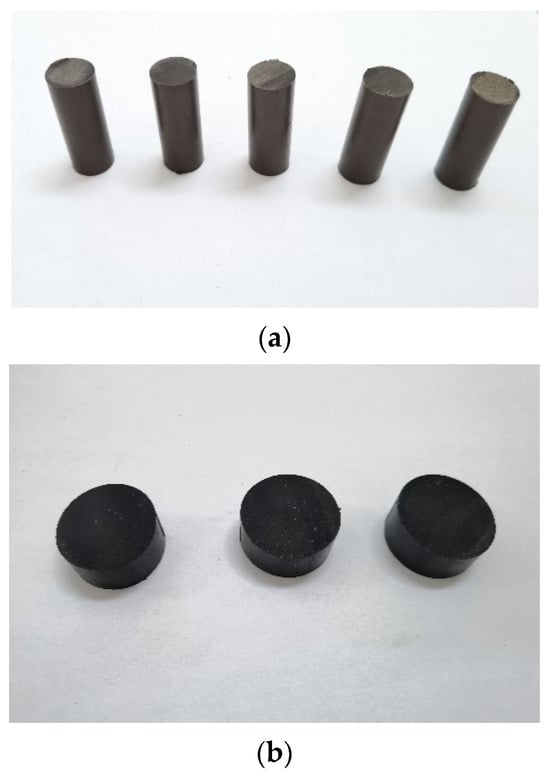 The GS seal ring consists of a step seal ring and an O-ring. The step seal ring is made of copper-filled polytetrafluoroethylene (PTFE), and the O-ring is made of modified nitrile rubber (NBR). According to the requirements of GB/T 1041-1992 [] ‘Test Method for Plastic Compression Properties’, cylindrical specimens of copper-filled PTFE with a diameter of 12 mm and a length of 30 mm were prepared, totaling 5 specimens, and compressed at a speed of 1 mm/min. Following the requirements of GB/T 7757-2009 [] ‘Determination of Compression Stress–strain Properties of Sulfur-Cured Rubber or Thermoplastic Rubber’, cylindrical specimens of nitrile rubber rod with a diameter of 29 mm and a length of 12 mm were prepared, totaling 3 specimens, and compressed at a speed of 10 mm/min. The test materials were supplied by the seal ring manufacturer. Figure 4a shows the PTFE specimen, and Figure 4b shows the NBR specimen.