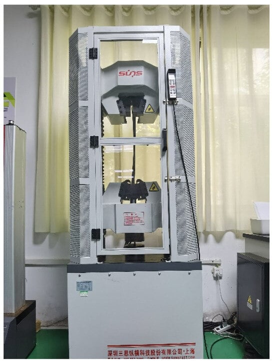 The specimens were subjected to uniaxial compression tests using the WAW-600D (SUNPOCTM, Shenzhen, China) servo-hydraulic universal testing machine, as shown in Figure 5. The stress–strain curves of the specimens were obtained. By analyzing the stress–strain curves of five PTFE specimens, the average elastic modulus of PTFE was calculated to be 292 MPa, with a Poisson’s ratio of 0.45. The stress–strain curve test data for NBR were imported into the ABAQUS property module, and a constitutive model for NBR material was fitted using the material evaluation function. In this study, the Mooney–Rivlin hyperelastic model was chosen, with a strain energy density function as follows: