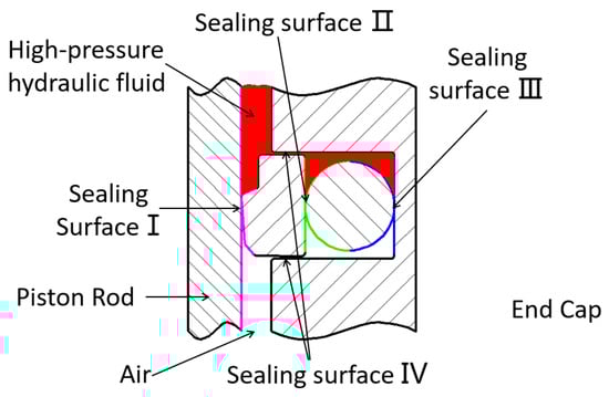 There were four contact interfaces in total. Sealing surface I: step seal ring with the hydro-pneumatic spring piston rod. Sealing surface II: step seal ring with the O-ring. Sealing surface III: O-ring and the groove on the hydro-pneumatic spring end cap seal. Contact surface IV: step seal ring with the groove on the hydro-pneumatic spring end cap seal. Among these, Sealing surfaces I to III represent pressure penetration surfaces, as shown in Figure 7.