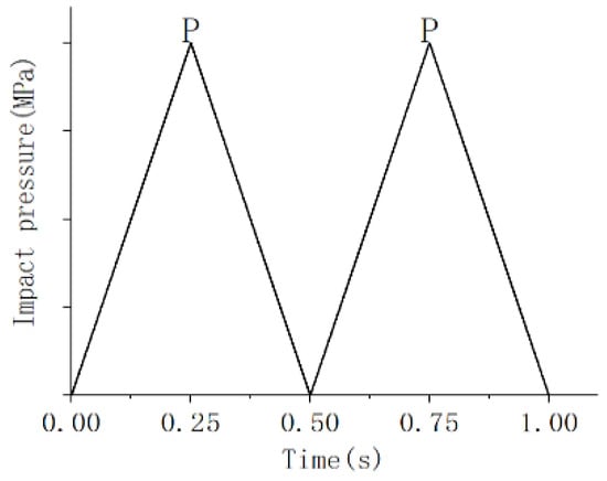 To realistically simulate the seal ring’s response to pressure shock caused by high-pressure hydraulic oil in the working conditions of the hydro-pneumatic spring, a simulated fluid pressure with a frequency of 2 Hz was applied to the seal ring. This analysis aimed to assess the sealing performance between the seal ring and the end cap and piston rod interface under cyclic pressure shock conditions. As shown in Figure 8, the pressure shock cycle included pressure values ranging from 5 to 30 MPa with a 5 MPa increment; the peak value of pressure value is “P”.