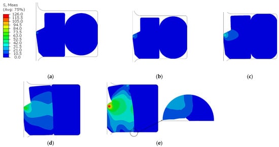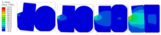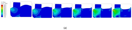 By analyzing the deformation and stress of the seal ring under different compression rates, the stress concentration position of the seal ring during operation could be obtained, and the influence of the compression rate on the shape of the seal ring could be judged. After completing the testing of the sealing contact surface in the first step, the second step of the piston rod compression seal ring action was carried out. The stress nephogram of the seal ring corresponding to the completion of the second step of the GS seal ring under different compression rates is shown in Figure 10.