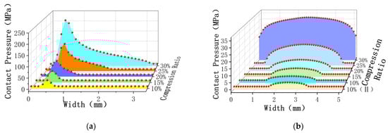 Contact pressure on sealing surfaces at different compression ratios: (a) contact pressure of the sealing surface I, (b) contact pressure of the sealing surface III.