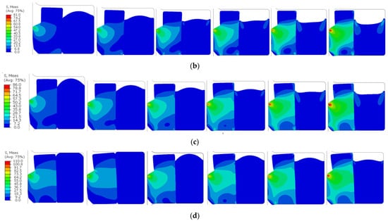 Stress nephogram of the sealing ring under different compression ratios and pressure impacts: (a) compression ratio of 10%, (b) compression ratio of 15%, (c) compression ratio of 20%, (d) compression ratio of 25%.