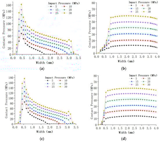 The necessary condition to ensure the sealing of the sealing ring is that the maximum contact pressure on the sealing contact surface must be greater than or equal to the high hydraulic pressure []. By analyzing the contact pressure on the sealing surface of the sealing ring, we could assess whether the sealing performance of the sealing ring meets the requirements. Section 3.1 and Section 3.2.2 have already excluded the cases of 30% and 10% compression ratios. Therefore, the following analysis will only focus on the situations where the compression ratios are 15%, 20%, and 25%, concerning the sealing ring’s response to pressure impacts.