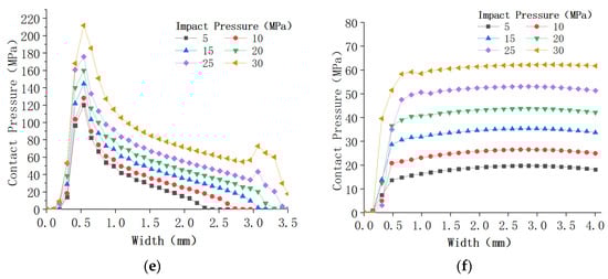Contact pressure curves on sealing surfaces under different compression ratios and pressure impacts: (a) compression ratio 15%, sealing surface I, (b) compression ratio 15%, sealing surface III, (c) compression ratio 20%, sealing surface I, (d) compression ratio 20%, sealing surface III, (e) compression ratio 25%, sealing surface I, (f) compression ratio 25%, sealing surface III.