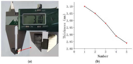 After subjecting GS sealing rings with a 15% compression ratio to a reciprocating loading test for varying numbers of cycles from left to right, specifically 1000, 2000, 3000, 4000, and 4600 cycles, we obtained five worn step seal rings, as shown in Figure 15. These step seal rings exhibited varying degrees of wear and deformation. The step seal ring after 4600 cycles of reciprocating testing suffered the most severe wear, with the lip completely worn flat, presenting an inclined surface overall. The maximum thickness of the cross-section for the five worn step seal rings was measured, as shown in Figure 16.