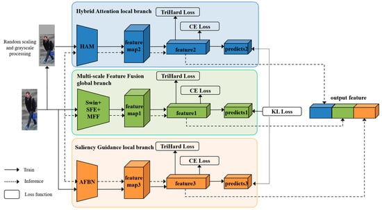 These methods can extract advanced abstract features and effectively improve the accuracy of model recognition. The methods for extracting features from pedestrian images can be categorized into two distinct groups: global feature learning methods and local feature learning methods. Global feature learning methods usually extract features from pedestrian images [,,], which makes it difficult to capture detailed information about pedestrians. Local feature-learning methods aim to learn the discriminative features of pedestrians and ensure the alignment of each local feature. Commonly, local feature learning methods include predefined stripe segmentation [,], multi-scale fusion [,,], soft attention [,,], pedestrian semantic extraction [,,], and global-local feature- learning [,,]. These techniques can mitigate challenges, such as occlusions, errors in boundary detection, and variations in viewpoints and poses.