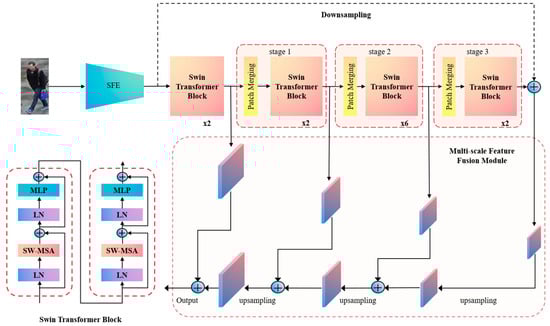 This branch is designed hierarchically in an end-to-end manner, utilizing a Swin Transformer [] as the backbone network. It incorporates Shallow Feature Extraction (SFE) and Multi-scale Feature Fusion (MFF) techniques to extract diverse global feature information from pedestrians across multiple scales. The structure is depicted in Figure 2.