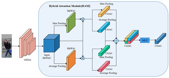 As depicted in Figure 4, the processed image is first input into OSNet [] for feature extraction, and then the extracted feature is input into the hybrid attention module for maximum pooling and average pooling operations to compress the channels and output two-dimensional maps and . Maximum pooling helps to retain significant information by selecting the largest pixel value in a specific region to represent the region. Average pooling computes the average value of pixels within a specific region, representing the region effectively. This approach mitigates errors caused by limited area sizes during feature compression, ensuring the preservation of global information within the feature. After that, the generated two-dimensional map is element-wise multiplied with the original feature map to acquire features encompassing both salient and global information within the channel dimension. The calculation process is shown in Equations (1) and (2):