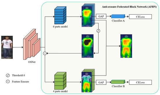 The AFBN uses the OSNet of [] as the backbone feature extraction network, and the feature maps extracted from the backbone network are input into parallel classification branches, each consisting of block networks. In order to avoid block overlapping and invalidation of the same region after erasure, the number of blocks in the two branches is different.