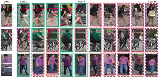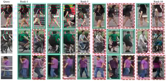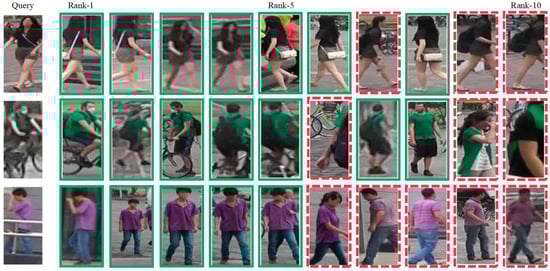 In order to compare the performance of the model more intuitively, we visualize the recognition results on the Market-1501 dataset and compare them with the results from other methods. These visualizations are presented in Figure 6, Figure 7 and Figure 8. Notably, MFFNet demonstrates excellent recognition efficacy and robustness, particularly under illumination differences, scale changes, and occlusion scenes. In each row, the first column of images represents the target pedestrian for the query, while the subsequent ten columns depict the recognition outcomes sorted based on similarity. The green solid line indicates that the pedestrian in the image corresponds to the queried pedestrian ID, whereas the red dashed line indicates a different pedestrian ID from that of the query.