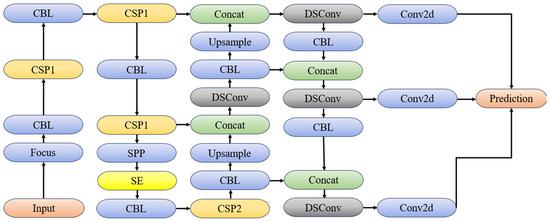 YOLO is currently a commonly used target detection neural network [14,15,16]. YOLOv5 is an object detection model that is designed for real-time object detection and is known for its speed and accuracy [17]. Regarding its applications, YOLOv5 has garnered extensive adoption across diverse domains. It has proven effective in real-time vehicle detection [18] and object detection in maritime datasets [19]. The model’s remarkable capability to deliver rapid inference speeds renders it highly suitable for real-time scenarios requiring swift and precise object detection. The architecture of YOLOv5 consists of several key components: The backbone is responsible for extracting features from the input image. YOLOv5 utilizes CSPNet (Cross Stage Hierarchical Networks) as the backbone, which is an efficient and scalable architecture for feature extraction. The neck connects the backbone to the detection head and is responsible for aggregating and refining the features extracted by the backbone. YOLOv5 employs PANet (Path Aggregation Network) as the neck, which helps in improving the information flow between layers. The detection head is responsible for predicting the object bounding boxes, class probabilities, and objectness scores. YOLOv5 utilizes anchor boxes to predict the bounding box coordinates and applies a sigmoid activation function to the output for better accuracy. The architecture of the improved YOLOv5 is shown in Figure 4.