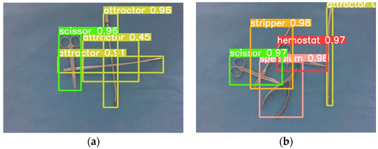 The examples (a) and (b) of detection results of the stacked surgical instruments sample.