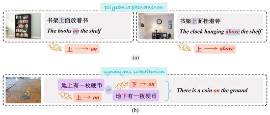 In the realm of SLU, extant research exhibits a pronounced concentration on the context of the English language, while there is a noticeable lack of investigations on non-English settings. Extending in this direction, Zhan et al. [14] proposed Spatial Cognition Evaluation (SpaCE) in order to benchmark Chinese spatial language understanding via abnormal spatial semantics recognition, spatial role labeling, and spatial scene matching. Unlike in the context of English, Chinese SLU has some specific challenges due to its ambiguous characteristics and complex grammar. For example, Figure 1a shows the phenomenon of polysemia among Chinese spatial prepositions. The word “上” in the sentence “书架上面放着书” (the books on the shelf) means “on”, while the “上” in the sentence ‘书架上面挂着钟”’ (the clock hanging above the shelf) means “above”. With the same word “上” or phrase “上面”, the sentences may express different spatial relationships, which is a common phenomenon in Chinese. Meanwhile, some conflicting prepositions may express the same meaning, which is also known as the substitution of synonyms. In Figure 1b, the “上” (which usually denotes “on”) in “地上有一枚硬币” and the “下” (which usually denotes “under”) in “地下有一枚硬币” describe the same thing, i.e., “there is a coin on the ground”. The substitution of synonyms occurs in many languages but does so more frequently in Chinese due to the lax usage of syntax. In these situations, traditional methods that extract spatial information based on spatial prepositions impair performance. The solution to this issue is to reason spatial relationships with the holistic semantics of a sentence and the common linguistic knowledge of the Chinese language.