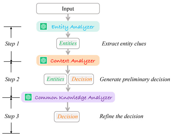 - Step-3: Common Knowledge Analyzer. The entities and context-based preliminary decisions generated in the first two steps are used to refine and generate cogitative results while considering common sense and language knowledge. In this step, the three tasks adopt the same instruction, as “pay attention to the Chinese-language characters” is added to help LLMs focus on Chinese language usage. The templates of the CKA are designed as follows: