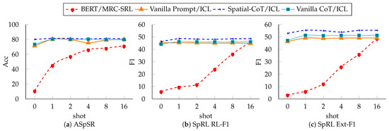 - Implementation Details. For supervised ASpSR, we use a BERT-base backbone and a binary linear classifier. For supervised SpRL, we follow reference [42] to use a BERT-base model as the base encoder and use two special symbols <p> and </p> to mark the predicate of the input sentence. We adopt Adam as optimizer, and the warmup rate is 0.05, the initial learning rate is 1 × 10−5. For LLM-based methods, we select ChatGPT3.5 (https://openai.com/blog/chatgpt, accessed on 1 September 2023), which is the top-performing open-source large language model. The temperature value of ChatGPT is set to 0.2. The detailed parameters are presented in Appendix B.