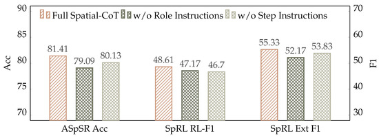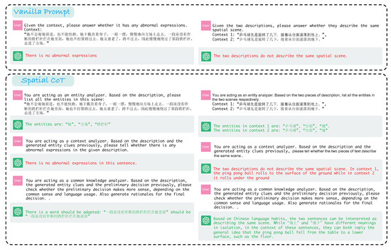 However, conventional CoT simply employs a single prompt template such as “let us think step by step” to inspire the LLM [37,38,39]. These methods improve reasoning performance on larger LLMs but fail to indicate the explicit reasoning steps for the provided task. Beyond single prompt CoT, Wei et al. [40] encourage internal dialogue by forcing the LLM to generate a sequence of intermediate steps for reasoning problems. Zhou et al. [41] go a step further; they (automatically) break a complex problem into simpler sub-problems and then solve them in sequence. Previous multi-step CoT methods primarily focus on arithmetic problems or logical problems, which are relatively easily symbolized and generalized. However, these strategies may struggle to maintain control over intermediate reasoning steps when confronted with diverse tasks, making them less applicable to our spatial understanding problem. Thus, in this study, we focused on the spatial understanding problem and designed the Spatial-CoT framework, aiming to solve the challenges of the phenomenon of polysemia and the substitution of synonyms in the Chinese language that previous methods have failed to address.