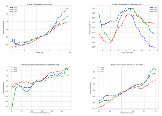 Among the socioeconomic features, the average living population across all commercial districts continuously decreased from about 2.84 million (2019) to 2.74 million (2021). This can be explained by the implementation of social distancing, which accelerated telecommuting, virtual classes and remote working. For land appraisal value, the average of the median value of each commercial district was used, and the growth of the real estate market led to consistent increments over time.