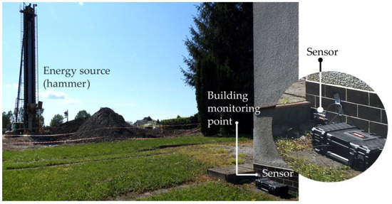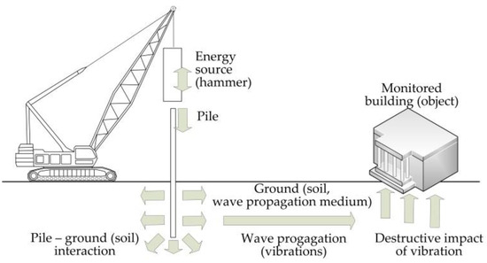 When determining the effects of energy on building structures, attempts are made to estimate and model vibrations theoretically, as mentioned. An inability to find the real impact of energy on buildings analytically and precisely is due to the heterogeneous medium between the vibration source and the building. The medium comprises layers, such as sand, silt, and clay. The layers are characterised by variable thickness, and other disturbances are caused by underground structures, such as pipelines or foundations of structures other than the tested one. The impact on the object can only be precisely determined by measuring the tested object (Figure 2).