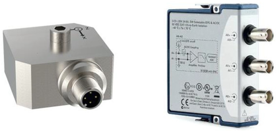 The presented original vibration-recording and analysis system has a classic structure, which is presented in Figure 3. The measurement signal is generated by a vibration sensor (accelerometer) installed directly on the tested object (Figure 4, Table 1). The accelerometer output signal is delivered to the measurement card dedicated to dynamic measurements (Figure 3 and Figure 4, Table 1 and Table 2).