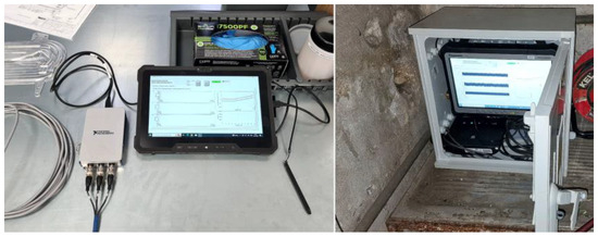 The acquisition card processing data from three channels of the vibration sensor must be placed in a housing unit. The dedicated acquisition card housing unit is presented in Figure 5. A one-slot NI cDAQ-9171 chassis was used. This kind of housing is designed for use with C Series modules. The housing provides power to the acquisition card and supports data transmission in accordance with the Hi-Speed USB 2.0 standard. The measurement system software is dedicated to the Windows environment. In the described case, the measurement system was run on a reinforced (“rugged line”) tablet from Dell (Figure 5). Devices in industrial applications cannot be expected to operate in sterile conditions. They may be at risk, among others, from the negative effects of dust, temperature, and humidity. Therefore, a device from the “rugged” line was used. The manufacturer has declared that the equipment is capable of functioning within a temperature range of (−29) to (+63) degrees Celsius. The tablet is dustproof and resistant to low-pressure water jets directed at any angle. The right side of Figure 5 shows the housing unit in which the system is placed for the duration of the measurements. It provides additional protection against external influences and interference by unauthorised persons.