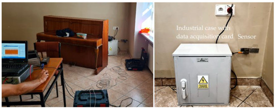 Vibration measurements during construction work usually take a long time. They cover the entire period of work that may have a negative impact on buildings. In order to improve the reliability of measurement recording, preliminary tests of data collection, registration, transmission, and remote access are first carried out (Figure 6). During measurements, all elements of the measuring system are closed in a housing unit. The housing unit meets the basic requirements of standards for protection against ingress of solid objects (IP4X), ingress of water (IPX4), impacts (IK10), and exposure to fire (UL 94 V-0) (Figure 6, right side). The housing prevents objects larger than 1 mm in diameter, such as larger insects, from gaining access to the interior. The housing provides protection against water being sprayed from any direction. The upper part of the housing unit should withstand the impact of an object weighing 5 kg dropped from a height of 40 cm. With a direct flame impact on the housing unit, the burning process should stop within 10 s and the housing material does not generate flaming drips. The housing is locked to protect the measurement system from accidental interference.