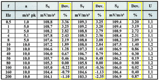 In order to ensure reliable data, the system has been checked and will be checked periodically for errors. The sensor (accelerometer) was calibrated in an accredited calibration laboratory, No. AP 006 (Main Mining Institute, National Research Institute, Research and Calibration Laboratory Team, Katowice, Poland). The parameters of the sensor have been confirmed by the calibration certificate No. 6128 of 10 February 2022. The error estimator is the standard deviation expressed in %. The standard deviation values for the transducer output signal in the x, y, and z planes is between (−2.23) and 3.36% (Figure 7). The obtained values were confirmed by the information provided by the manufacturer in the sensor data sheet (Table 1).