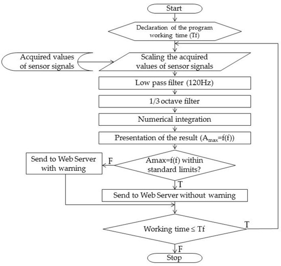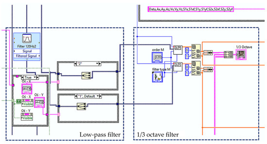 The measurement system was developed in the LabVIEW (National Instruments) development environment. LabVIEW is a graphical development environment (Figure 8). Its biggest advantage is the easy integration of input/output devices, such as measurement cards, devices compatible with the GPIB, PXI, and IMAQ standard, and PLC controllers. LabVIEW environments provide tools for controlling and retrieving data from hardware. Input data can be entered directly by the user, come from data stored on the disk, come from control and measurement equipment, from network sources based on standard communication protocols (TCP/IP, FTP, etc.), and from internal environment protocols (e.g., data socket). Data processing in the basic version is limited to implementing algebraic, logical, and trigonometric functions. More advanced environment distributions have predefined groups of subroutines, allowing to use more complex functions to do more or less complex calculations: filtering, spectral analysis, FFT transform, and Hilbert transform. Communication with the equipment can be carried out using devices connected locally by cable or wireless, and devices with a network interface or using the http protocol and websites.