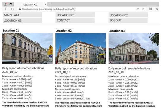 The vibration monitoring system presented in this publication combines elements from different suppliers to work together smoothly and provide reliable measurement data. A significant difference from commercial systems available on the international market is the flexible structure of the measurement system, adapted to the requirements of the [37], with the possibility of easy adaptation to other standard requirements. International corporations producing vibration-recording systems have no business interest in creating systems that qualify vibration values under locally applicable standards. Introducing an international standard in a small country is easier than getting support from an international hardware and software manufacturer for the local standard. The data presentation has two levels—system administrator- and user-level access to measurement data. The obtained measurements instantly provide the user with information on the vibration classification (SWD range) and its potential impact on the structure (Section 3). Remote access with limited user privileges is provided. This type of data access is rare in commercial solutions. Commercial research systems are typically designed to be operated by qualified employees with extensive permissions. The cost of the presented, dedicated monitoring system (consisting of sensors, a data acquisition card, and software) is much lower than the cost of a closed system provided by recognised suppliers of this type of solution (e.g., Brüel and Kjær, Svantek).
