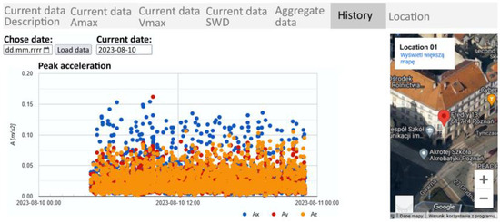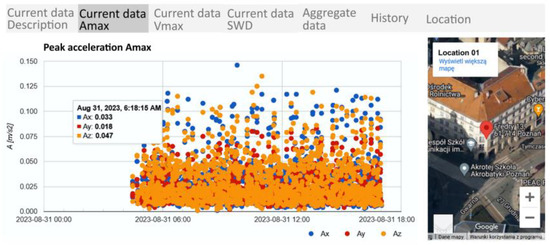 - “Current data—Amax”—graphical presentation of the peak acceleration values, A (m/s2), of vibrations in three directions recorded on the current day. It is possible to select a specific point with the mouse pointer and read the acceleration values at the indicated point in time (Figure 12).