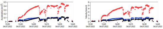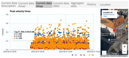 - “Current data—Vmax”—graphical presentation of the peak values of the velocity, V (m/s), of vibrations in three directions recorded on the current day. It is possible to select a specific point with the mouse pointer and read the acceleration values at the indicated point in time (Figure 13).