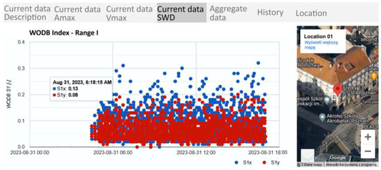 The main task performed by the user’s panel is the ability to become acquainted with the current values of accelerations and vibration velocities, as well as the WODB index values. The key for the end user is the information about in which period the highest vibrations occur and to which zones of impact on the building (SWD) they should be classified. The end user receives this most important information directly after selecting the measurement system in the “Current data—Description” tab (Figure 11). Work is underway to improve the quality of information presentation, i.e., to introduce the function of enlarging time courses and selecting any time range of the presented data.