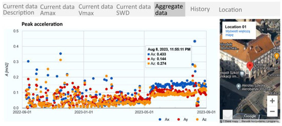 - “Aggregate data”—graphical presentation of the peak acceleration values, A (m/s2), of vibrations in three directions recorded since the start of the system operation (Figure 15).