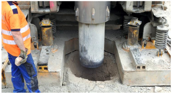 The FRANKI technology piles are made using a dynamic method, using a reusable guide pipe. In phase one, the guide tube is filled with concrete or gravel, then compacted using a freely falling compactor. This causes the pipe to sink into the ground. The number of blows per meter of pipe depth (pipe feed) determines the work, which reflects the bearing capacity of the soil. The process of making piles has a low noise level. However, it causes vibrations in the ground, propagating to the neighbouring building structures. To prevent negative impacts, the contractor applies optimisation by pre-drilling to a depth of 12 m in the place where the steel pipe is being driven (Figure 17).