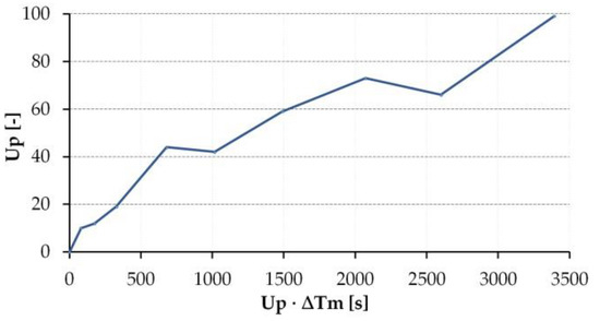 In the described case, the kinetic energy transferred to the substrate is constant (about 290 kJ), due to the constant drop height of the rammer (h = 6.5 m) and the rammer mass (4500 kg). The key element influencing the magnitude of dynamic interactions is the value of the force drive (force impulse) [45]. The power drive depends on the duration of contact with the soil substrate, during which the maximal speed of the compactor decreases to zero (full plasticisation of the soil substrate). The duration decreases as the stiffness of the subsoil increases. During the pile’s construction, the pile certificate is documented, in which the number of strokes per 1 m of pile immersion is counted (Figure 19). Considering the average time between individual shots, amounting to 8 s, a graph was drawn, showing the number of strokes as a function of the time needed to perform all strokes (Figure 20).