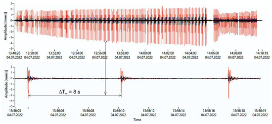 Time plot of the peak velocity values (X axis—blue waveform, Y axis—black waveform, Z axis—red waveform).
